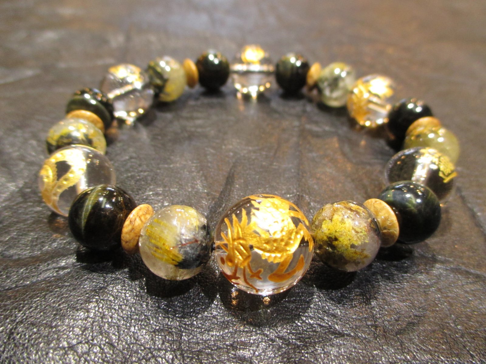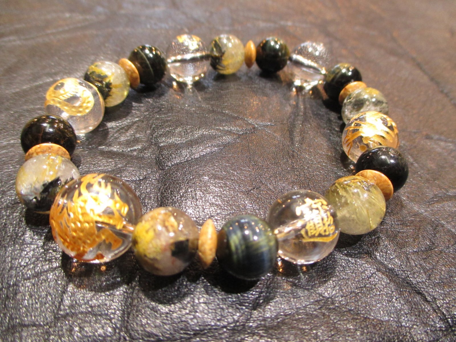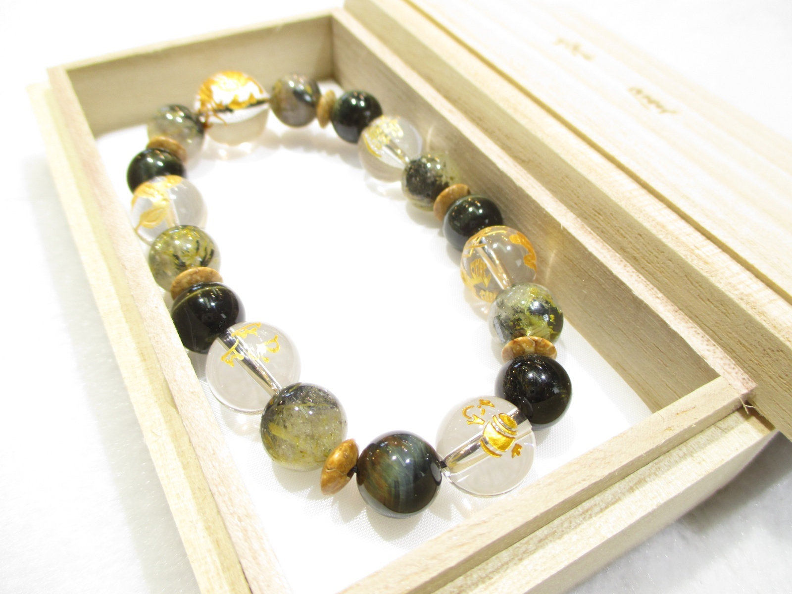 パワーストーン・京都/【金運・事業運・開運・人徳・霊的守護・健康長寿】【三面大黒天・打ち出の小槌・麒麟・皇帝龍・蛇神・招財進寶】彫刻【本水晶】【ブルータイガーアイ】【太陽ルチルクォーツ(ヘマタイト入り金針水晶)】【天竺菩提樹】ブレスレット≪GGR-061≫桐箱付き【伏見の京屋】